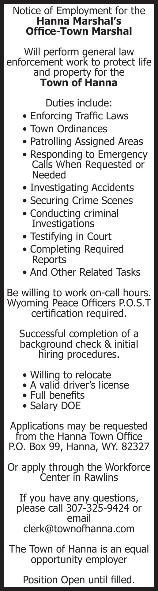 Jun 14, 2023. Town Of Hanna Police Officer Jobs from Southern Wyoming Jobs