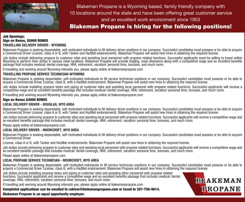 Nov 02, 2024. Blakeman Propane Drivers Jobs from Southern Wyoming Jobs