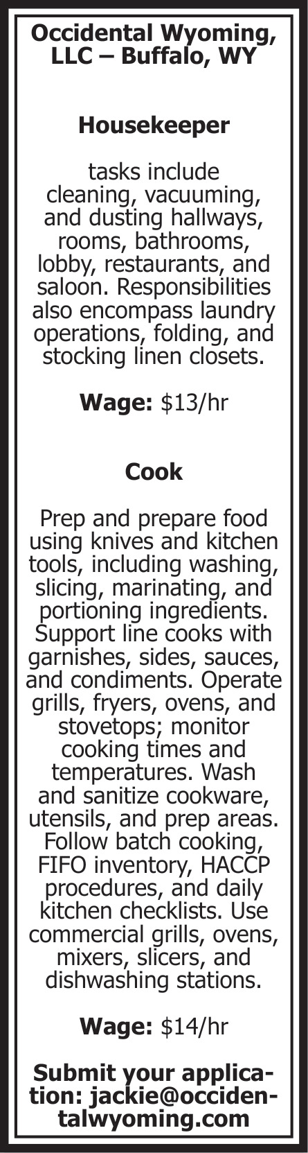 Nov 15, 2025. Occidental Wyoming LLC-Buffalo Cooks & Chefs Jobs from Southern Wyoming Jobs