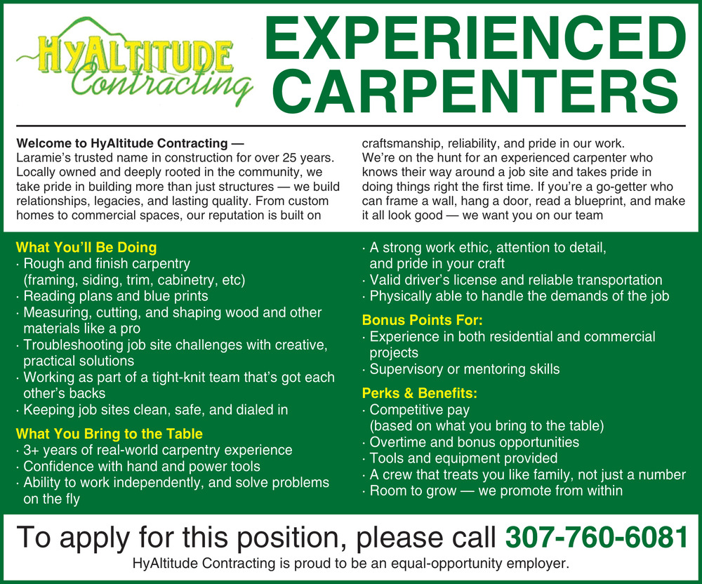 Jan 20, 2026. Hyaltitude Contracting Carpenters Jobs from Southern Wyoming Jobs
